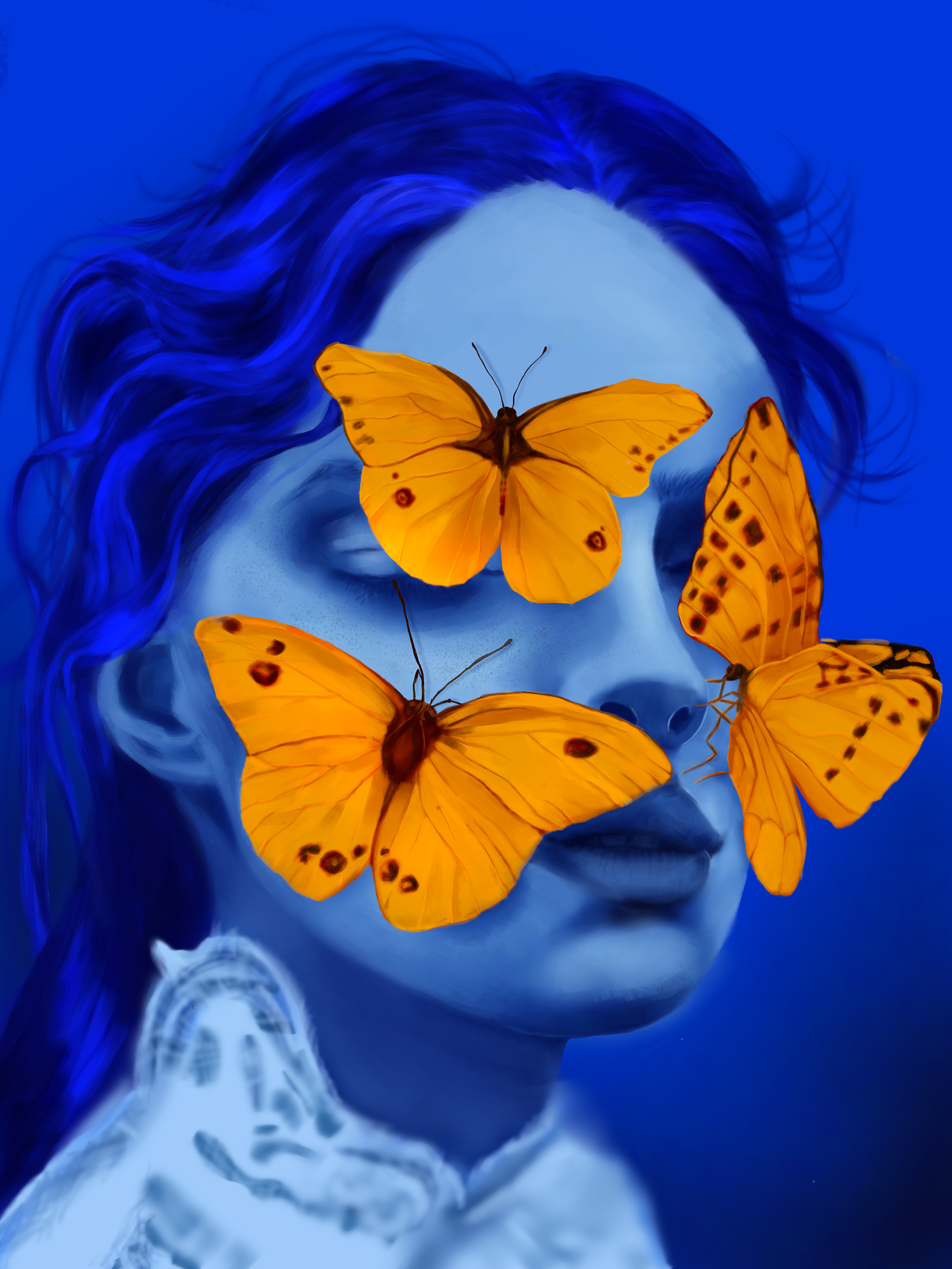 Blue Portrait of a Woman with Butterflies – Digital Art